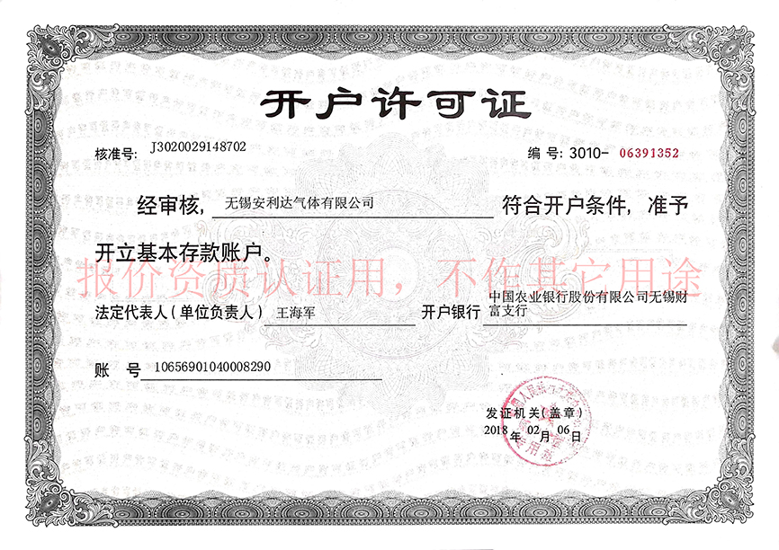 当前位置:首页>>资质中心>>无锡安利达气体银行开户许可证